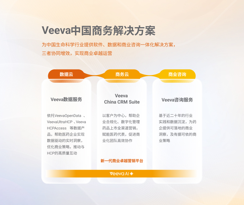 一站式中国商务云解决方案Veeva于2016年开始设立中国研发中心,从云软件、数据到商业咨询,我们用卓越产品和领先AI技术,赋能并药企商业化成功。