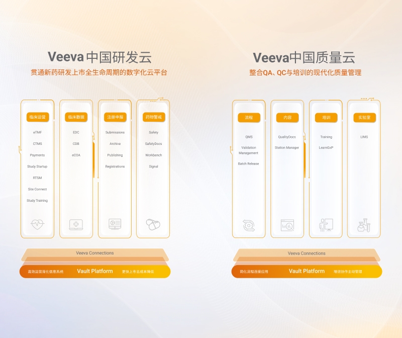 一体化中国研发及质量云解决方案依托成熟的Veeva Vault平台,创新提供覆盖新药全生命周期的一体化的系统解决方案,从临床数据、临床运营、药物警戒、注册申报与质量管理,简化和标准化流程,确保合规,加速新药审批,让创新疗法尽早惠及患者。