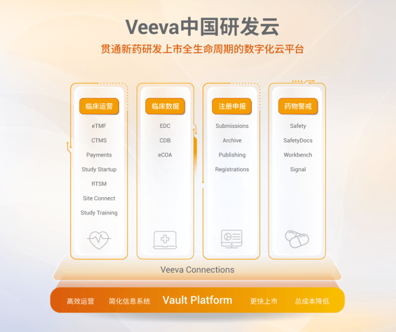 研发云打破临床、注册、安全领域的数据与流程孤岛,助力企业实现端到端业务流程贯通。Veeva 是全球首家且唯一一家在统一云平台之上提供整合式应用套件的企业,可帮助企业实现全球跨部门内容与数据的集中管理,全面提升运营效率与合规水平。