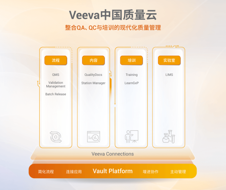质量云通过统一整合质量保证(QA)、质量控制(QC)与培训管理,实现全链路质量现代化。平台打破系统与流程孤岛,统一内容管理、质量管理体系(QMS)、实验室解决方案(LIMS)及内外部协作流程,在提升运营效率的同时,助力高品质药品更快生产、惠及更多患者。