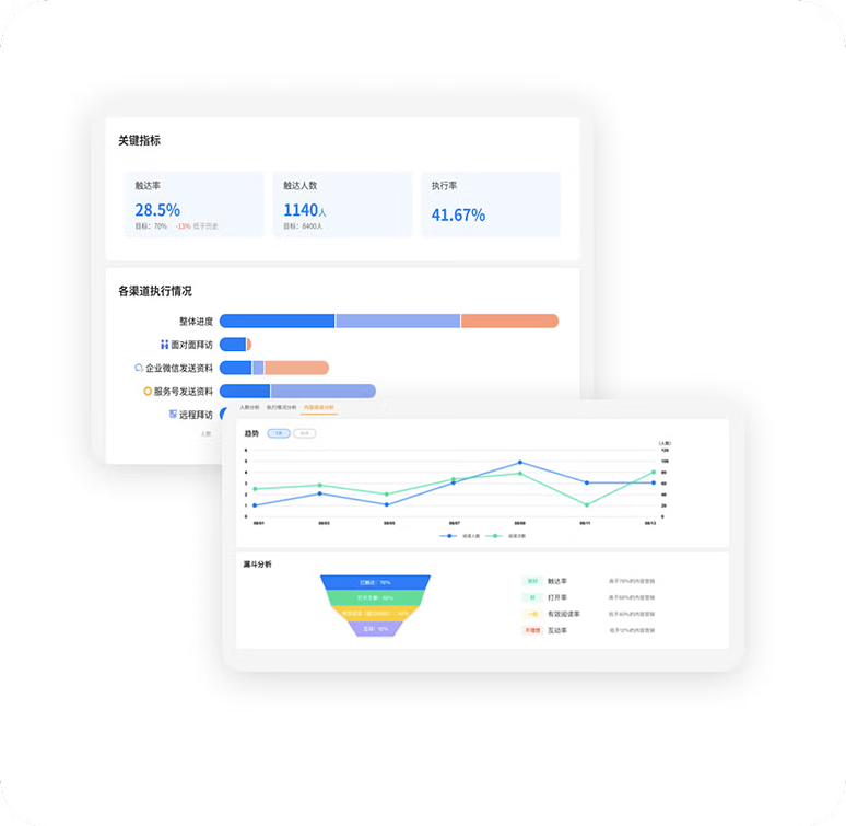 市场营销人员借助营销看板,基于业务目标实时追踪各渠道的执行情况,全面了解营销效果,及时优化营销和执行策略。