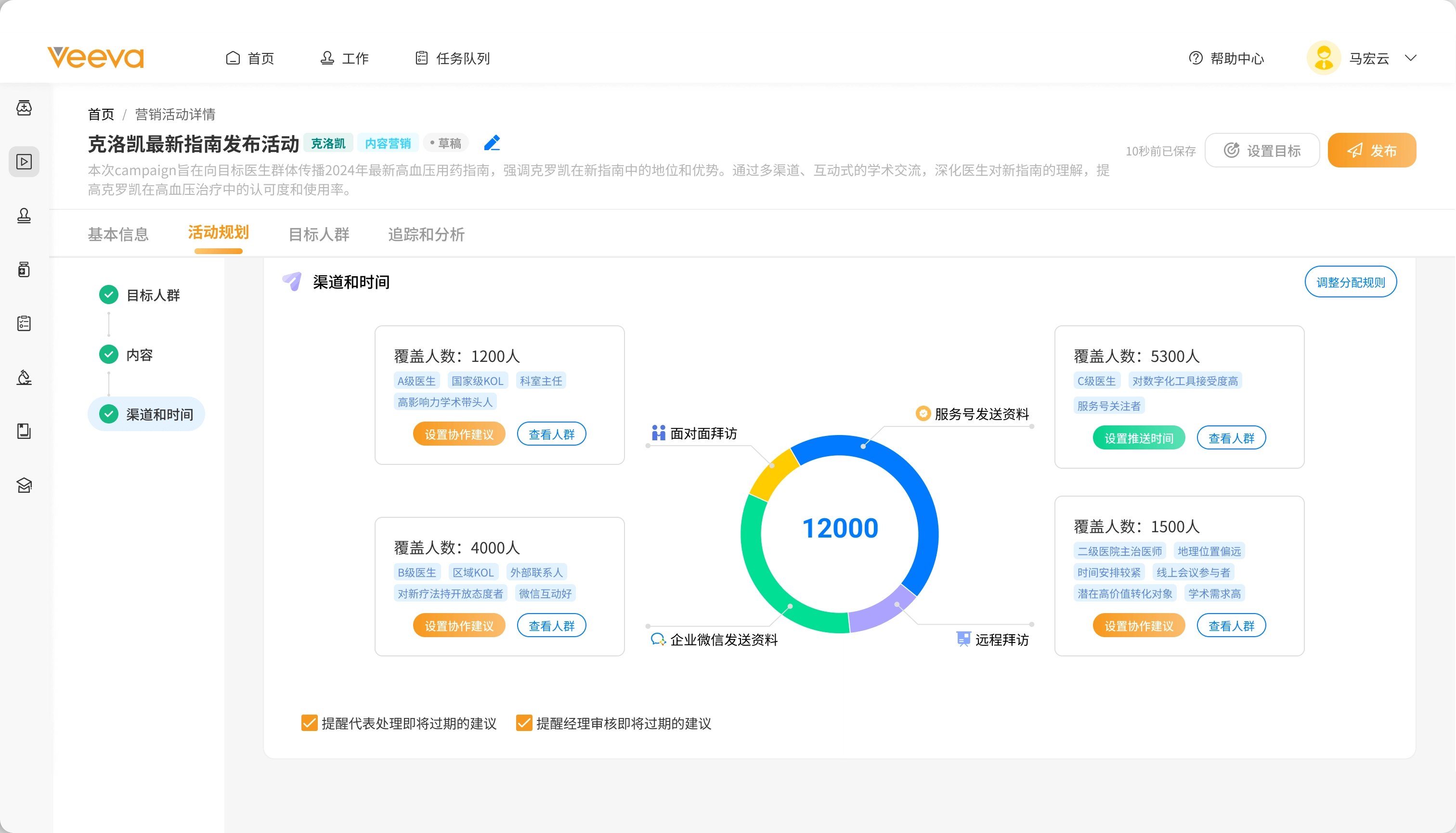 支持全渠道营销项目的协同管理,帮助药企高效规划并执行跨渠道活动。医药代表可根据活动任务灵活调整目标客户及渠道,并实时反馈建议与洞察。